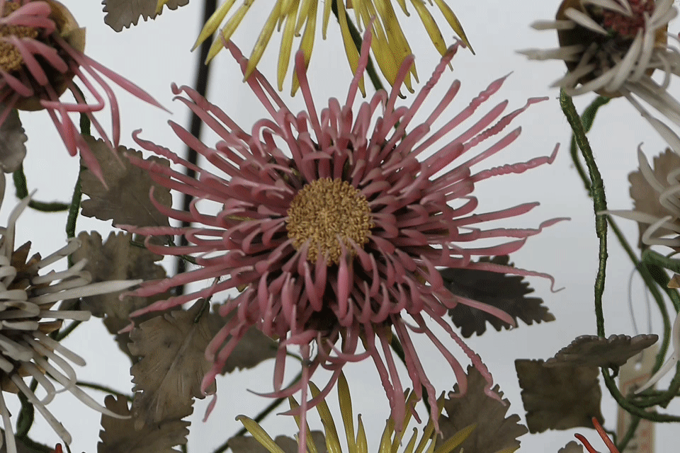 宫廷盆景多使用和田玉、珊瑚、青金石、各色料石(玻璃)来加工成菊花花瓣,用打籽绣、米珠、花丝技法来制作花蕊,用碧玉、岫岩玉、翡翠、点翠来制作花叶,使用金属丝将花瓣、花蕊和花叶固定在金属枝干上,终末再缠绕绿色丝线,以达到传神的仿生后果,每一盆齐是连城之珍。