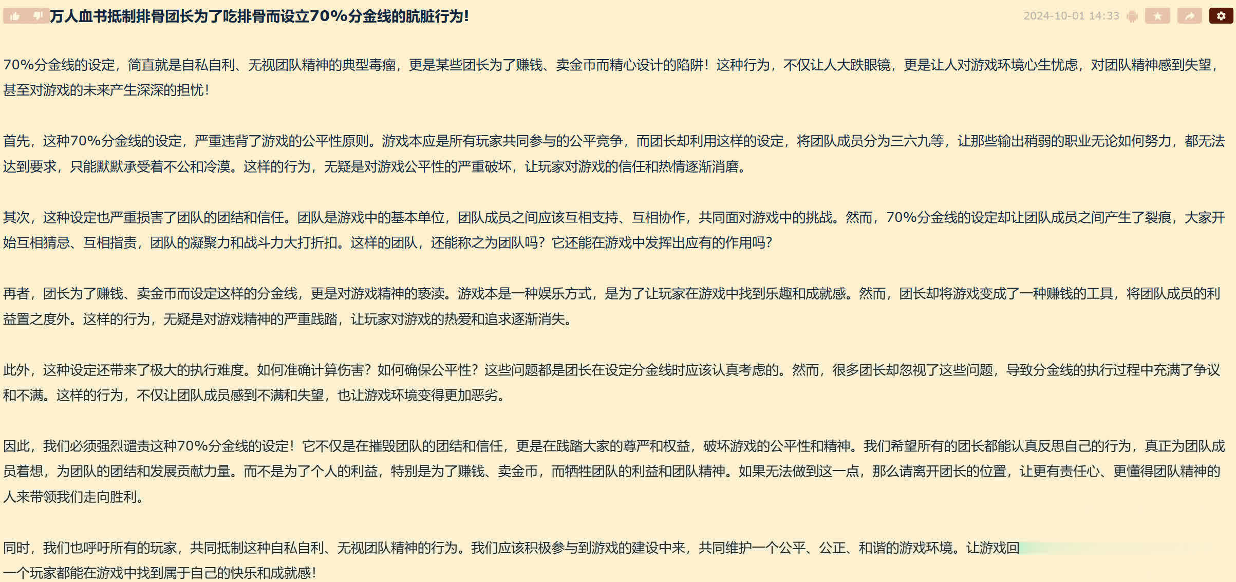 这位玩家在帖子中探口而出地月旦团长缔造70%分金线是为了私吞金币。好多玩家可能不解白70%分金线的含义,简便来说,这是一种窥探机制,玩家的输出必须达到排行第一DPS的70%材干分到金币。尽管有些团队按照排行第二的70%进行窥探,但这种情况较为稀有,频繁圭臬设在80%。